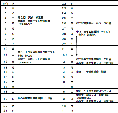 10月を迎え、受験生にとって最も大切な時期となりました。中学3年生は、夏期講習・受験対策集中特訓・新教研もぎテスト対策授業・単元別強化ゼミの受講を通じて、中学1年生から中学3年生の1学期までの総復習をし、基礎の確認から入試レベルまでの幅広く、密度の濃い学習を積み重ねてきました。