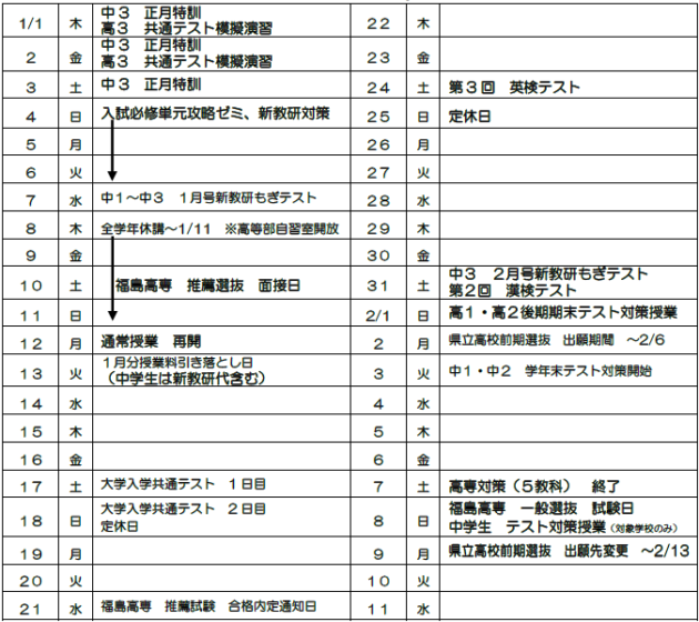 福島高専の推薦入試も1月10日(土)に実施され、1月21日(水)に合格内定発表が予定されています。推薦入試には全力で臨んでもらいたいところですが、学科によって志願倍率が高くなる傾向もあります。結果に一喜一憂しすぎることなく、2月8日(日)実施の一般入試が本番という意識で、最後まで気を緩めずに取り組んでください。